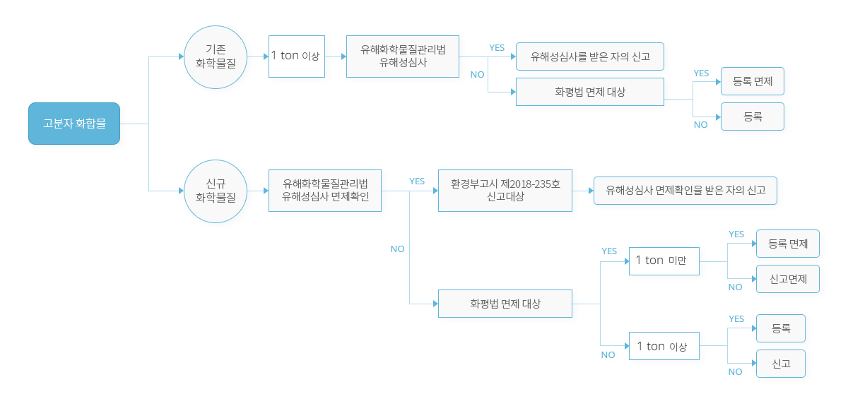 화평법에서 정의된 고분자화합물의 경우, 화학물질의 등록 시 특례가 적용되어 제조ㆍ수입량 톤수 범위별 제출 시험자료가 간소화되거나, 면제 조건에 부합하는 경우에는 등록 또는 신고가 아닌 등록ㆍ신고 면제를 받을 수 있습니다. 사업장에서 제조 또는 수입하는 화학물질이 고분자화합물로 판단되는 경우 해당 고분자화합물이 화평법에 따른 정의나 면제 조건 등에 부합하는지 확인하여야 합니다.