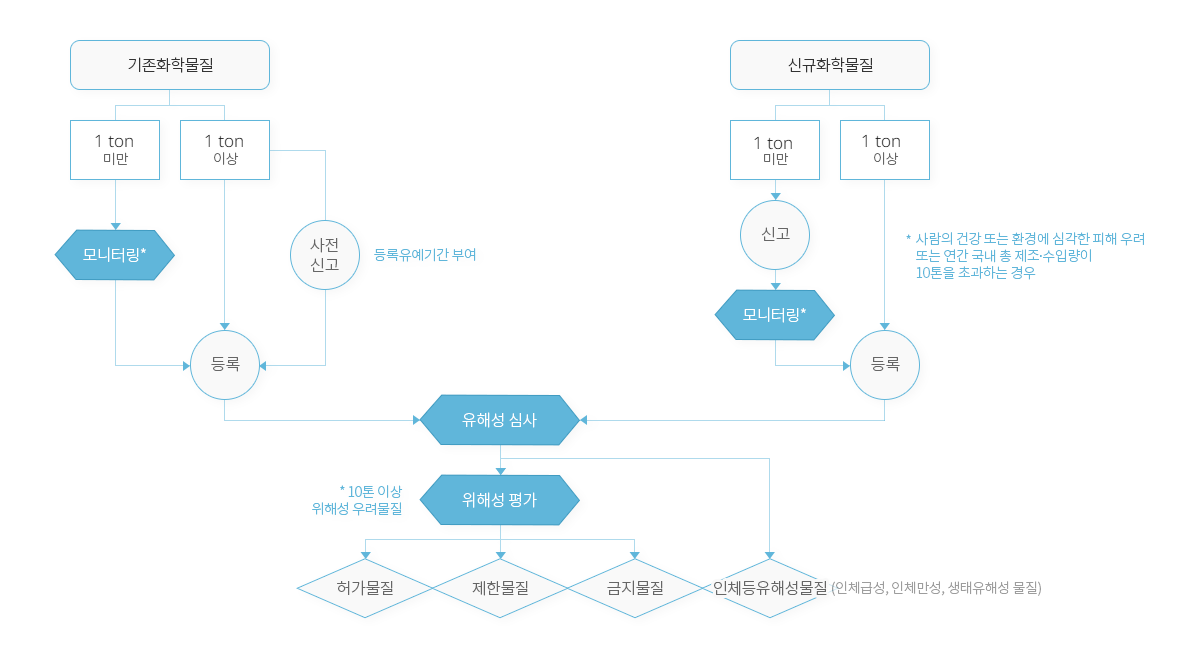 2019년 1월 1일부터 시행된 개정 화평법에 따라, 연간 1톤 이상 기존화학물질을 제조ㆍ수입하려는 자는 제조 또는 수입 전에 등록해야 하며, 2025년1월1일부터 신규화학물질의 경우 연간 1톤 미만은 신고, 연간1톤이상은 등록을 이행해야 합니다.
